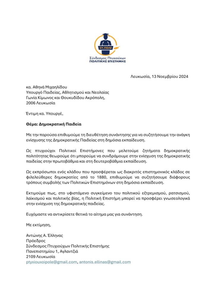 Επιστολή στην Υπουργό Παιδείας, Αθλητισμού και Νεολαίας για τη Δημοκρατική Παιδεία.