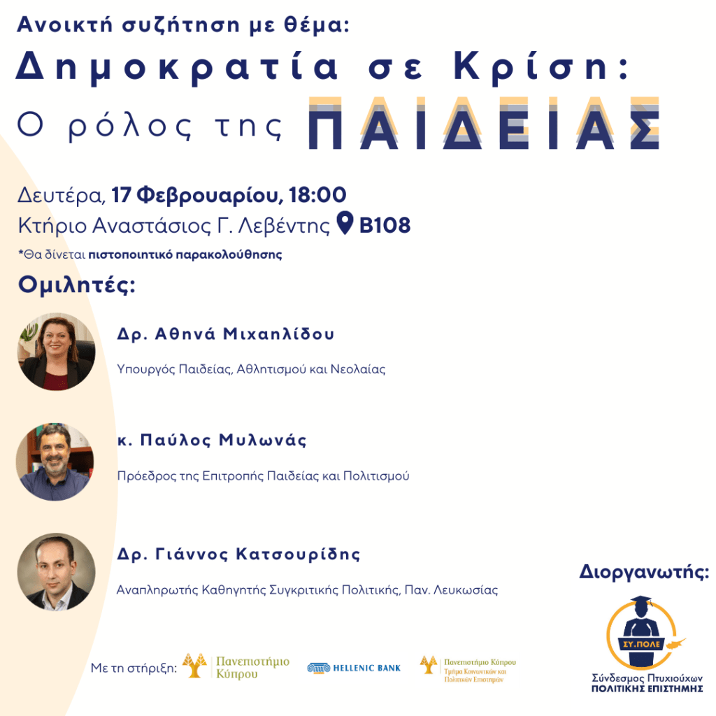 Η δημοκρατία δοκιμάζεται παγκοσμίως και, με βάση τις τελευταίες έρευνες, συρρικνώνεται σε πολλές χώρες. Δημοκρατικές αξίες αμφισβητούνται, πολιτικοί θεσμοί διαβρώνονται και πολιτικοί δρώντες απαξιώνονται, αδυνατώντας να επιλύσουν χρόνια και σύγχρονα ζητήματα. Συζητάμε τον ρόλο της παιδείας ως μέσου αναχαίτισης της κρίσης που αντιμετωπίζει σήμερα η δημοκρατία. Εξετάζουμε τις ευκαιρίες, προκλήσεις και εμπόδια στη διαμόρφωση του εκπαιδευτικού συστήματος, ώστε να συμβάλει στην αναστροφή της δημοκρατικής παλινδρόμησης. Στόχος της εκδήλωσης είναι να ανοίξει μια συζήτηση μεταξύ πολιτείας και κοινωνίας για το πώς η παιδεία μπορεί να ενισχύσει την πολιτότητα και την ανανέωση της δημοκρατίας. Τη συζήτηση οργανώνει ο Σύνδεσμος Πτυχιούχων Πολιτικής Επιστήμης.