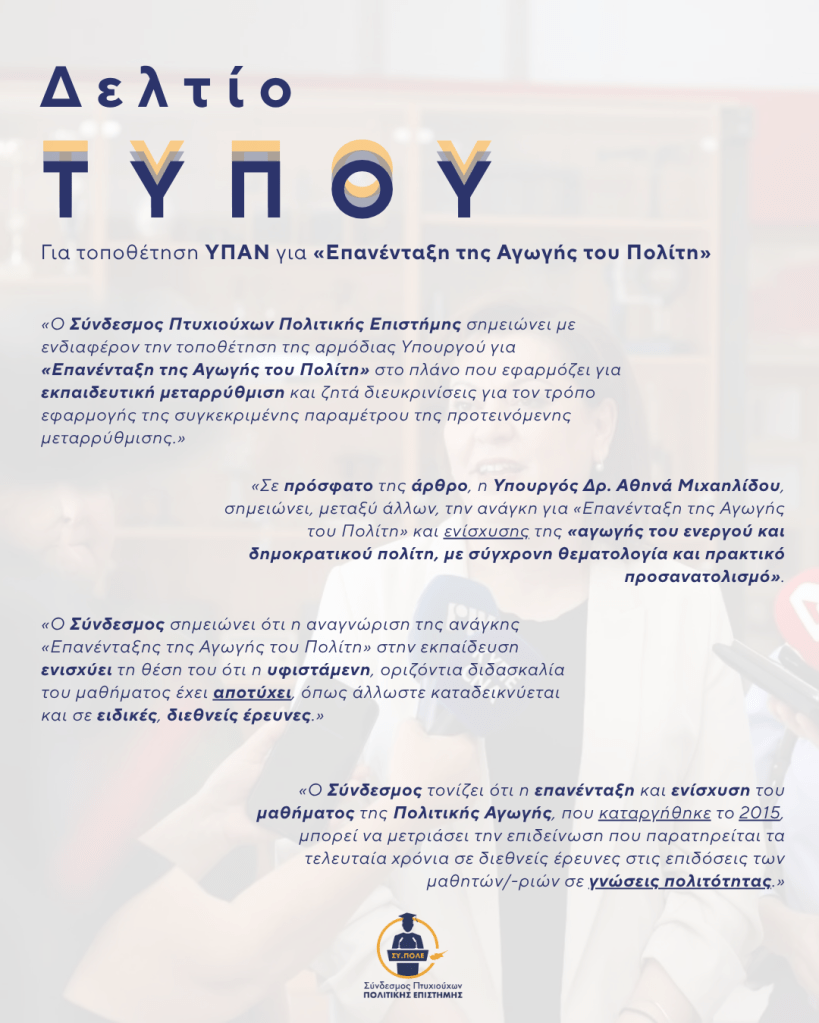 Ο Σύνδεσμος Πτυχιούχων Πολιτικής Επιστήμης σημειώνει με ενδιαφέρον την τοποθέτηση της αρμόδιας Υπουργού για «επανένταξη της αγωγής του πολίτη» στο πλάνο που εφαρμόζει για εκπαιδευτική μεταρρύθμιση και ζητά διευκρινίσεις για τον τρόπο εφαρμογής της συγκεκριμένης παραμέτρου της προτεινόμενης μεταρρύθμισης.