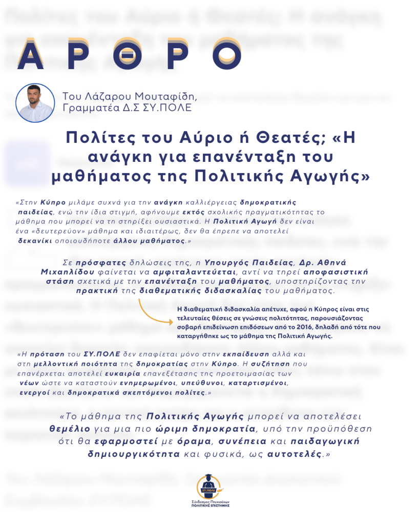 Στην Κύπρο μιλάμε συχνά για την ανάγκη καλλιέργειας δημοκρατικής παιδείας, ενώ την ίδια στιγμή, αφήνουμε εκτός σχολικής πραγματικότητας το μάθημα που μπορεί να τη στηρίξει ουσιαστικά. Η Πολιτική Αγωγή δεν είναι ένα «δευτερεύον» μάθημα και ιδιαιτέρως, δε θα έπρεπε να αποτελεί δεκανίκι οποιουδήποτε άλλου μαθήματος. Είναι με πάση αμφιβολία, ο ακρογωνιαίος λίθος πάνω στον οποίο βασίζεται και διαμορφώνεται η δημοκρατική κουλτούρα, η κριτική σκέψη και η συνείδηση των αυριανών πολιτών.